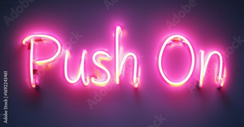 Bright pink neon sign displays words Push On against dark purple wall. Simple message, vibrant glow, modern aesthetic.