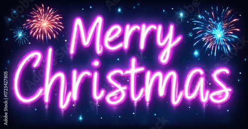 Bright pink neon text spells Merry Christmas. Fireworks sparkle around words against dark background. Festive, celebratory design.