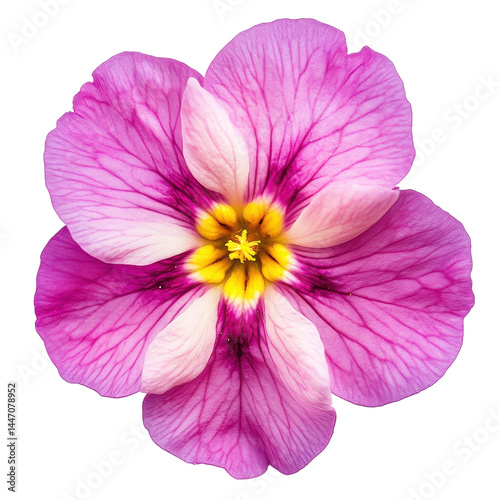 Bright pink Primula flower blooms beautifully on an isolated white background, Bright pink Primula flower. Isolated white background Yellow center. Nature.