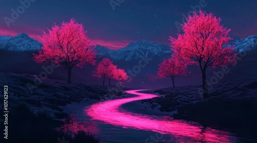 Bright pink trees beside a glowing river in a magical twilight landscape.