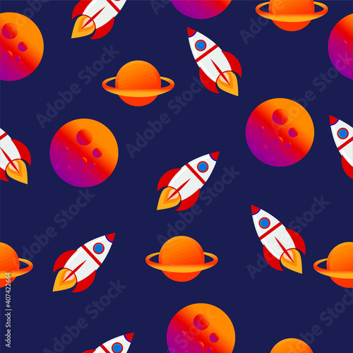 bright planets and rocket. child's drawing of space. flat vector pattern on space theme. universe with planets and rocket