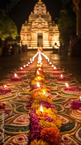 Bright rangoli made of flowers and diyas lining the pathway of a temple entrance, with a grand temple facade in the background. Copy space, happy Diwali background, traditional, Indian festival