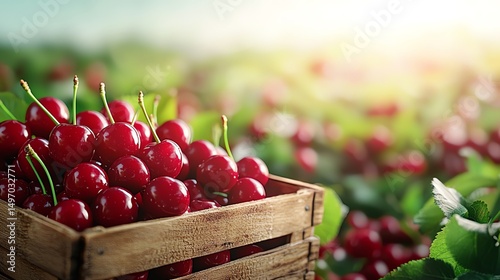 Bright red cherries in wooden baskets, fresh from the orchard, glistening under natural light