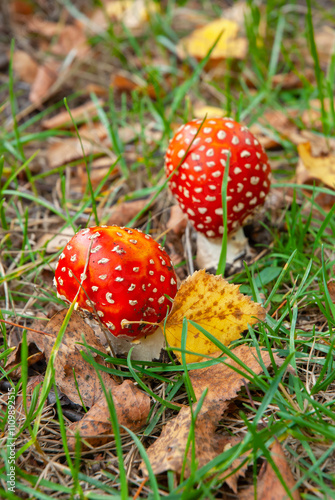 Bright red fly agaric in the grass in a forest clearing. Summer, good weather, time to pick mushrooms.