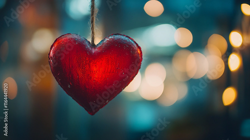 Bright red heart decoration hanging in a softly lit setting during the evening