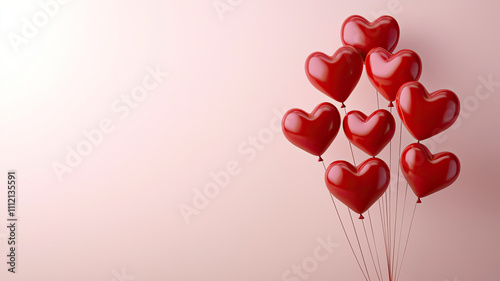 Bright red heart shaped balloons floating against soft background