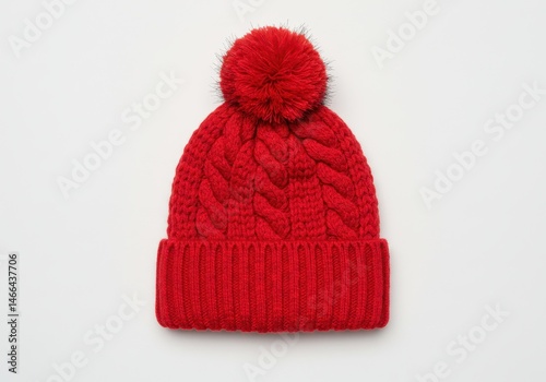 Bright red knitted winter hat with pompom on a white background, studio shot