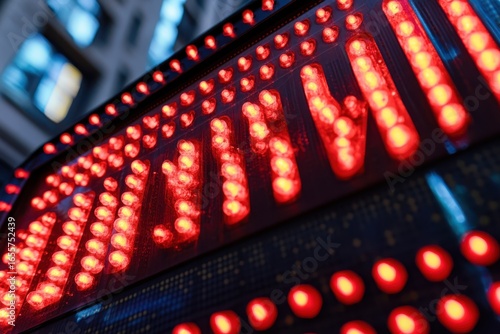 Bright red LED display board illuminating urban street scene at night with blurred buildings