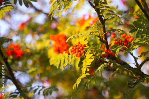 Bright ripe Rowan berries illuminated by the sunset sun beams