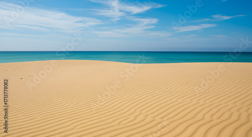 Bright Sandy Beach with Turquoise Ocean and Blue Sky Sunny Day