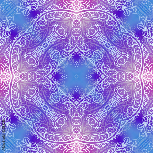 Bright seamless colorful ethnic christmas pattern. Collage with hand drawn branches, leaves, flowers. Batik style background, backdrop. Boho style. Imitation of the frost painting image on the window