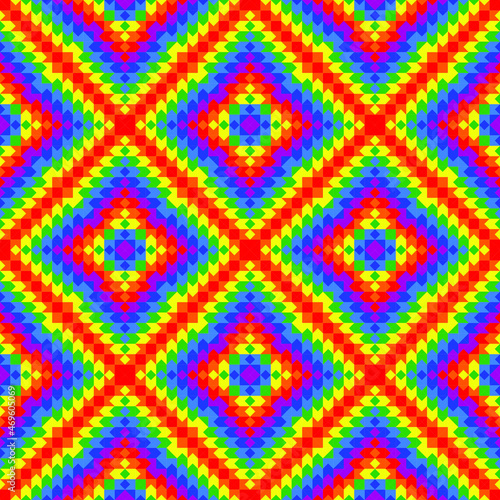 Bright seamless pixel pattern in Mexican style. Vivid tribal geometric triangles and squares ornament. Aztec rug background. Rainbow backdrop