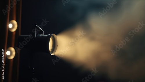 Bright spotlight illuminates smoky stage in a theatrical performance setting