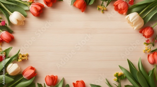 Bright spring blooms arranged in a circle on light wood, viewed from above, Pop Art, Bold colors, Flat design, High contrast, Minimalist composition.