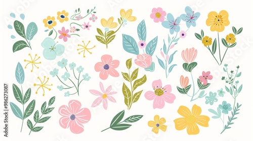 Bright Spring Floral Elements in Doodle Style with Pastel Colors.