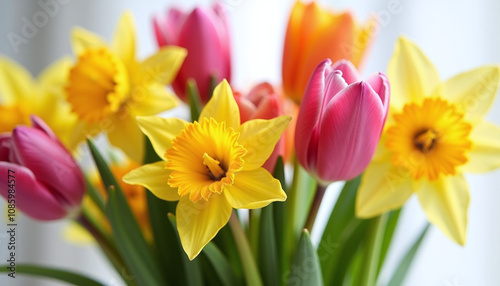 Bright spring flowers bouquet with tulips and daffodils against a soft background