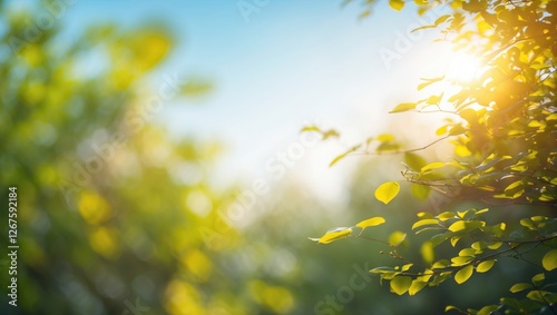 Bright summer sunlight filtering through blurred green foliage creating a serene and inviting background for text or advertisements.