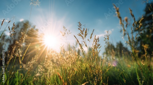 Bright summer sunlight pouring over a green meadow, lens flare and soft shadows on tall grass, vibrant colors, peaceful atmosphere, perfect for nature-themed background