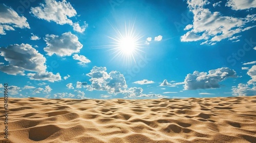 Bright Sun Over Expansive Desert Dunes and Blue Sky with Clouds