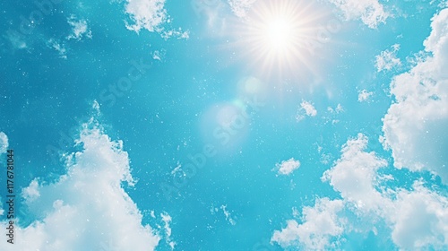 Bright Sun Shining Through Fluffy White Clouds In A Blue Sky