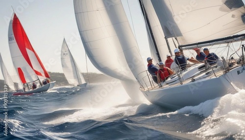 Bright sunlight illuminates a sailboat racing across the churning sea, with a determined sailor adjusting the sails to harness the wind and surge ahead.