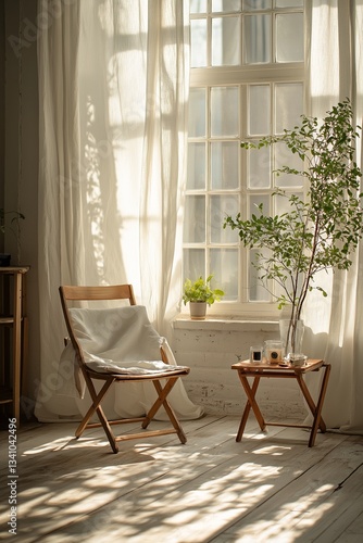 Bright sunlit room showcasing image creation services for photo shoots, featuring cozy atmosphere. Concept: serene space for image creation services for photo shoots, ideal for salon.