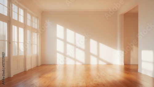 Bright Sunlit Room with Large Windows and Polished Wooden Floor
