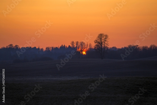 Bright sunset over the fields. Agricultural landscape in eastern Lithuania.
