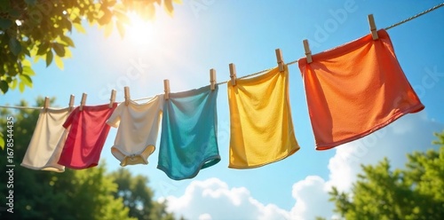 Bright sunshine illuminates a clothesline laden with freshly laundered clothes, gently swaying in the breeze A perfect summer scene of clean laundry drying naturally , breeze, natural light