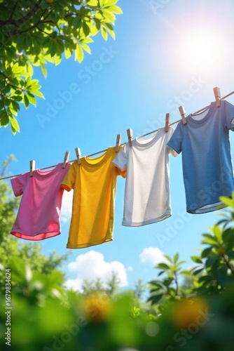 Bright sunshine illuminates a clothesline laden with freshly laundered clothing, gently swaying in the breeze A perfect summer scene of clean laundry drying naturally , bright, white