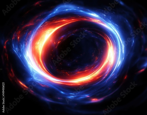 Bright swirling ring of fiery orange and cool blue light surrounding a dark central void creating a dynamic cosmic vortex effect