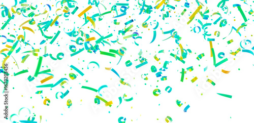 Bright teal, green, and yellow confetti falling on white background. Perfect for celebration, party, and festive designs.