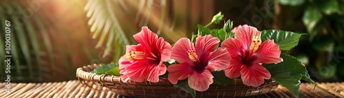 Bright Tropical Hibiscus Flowers Displayed in Bamboo Basket on Wooden Table with Golden Lighting