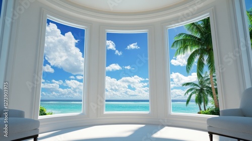 Bright tropical ocean view seen through large bay windows in a white room with two armchairs. Sunlight streams in, creating a tranquil and relaxing