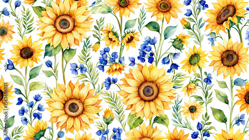 Bright Watercolor Sunflowers and Blue Delphinium Flowers Seamless Pattern
