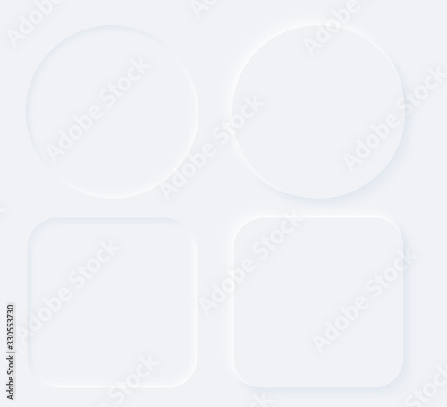 Bright white gradient buttons. Internet symbols on a background. Neumorphic effect icons. Shaped figure in trendy soft 3D style. Circle ellipse and cube set