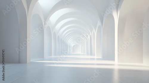 Bright white hallway with arches and columns.