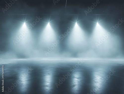 Bright White Spotlights Shining Through a Foggy Stage Setting, Perfect for Theater, Concerts, and Dramatic Event Backgrounds