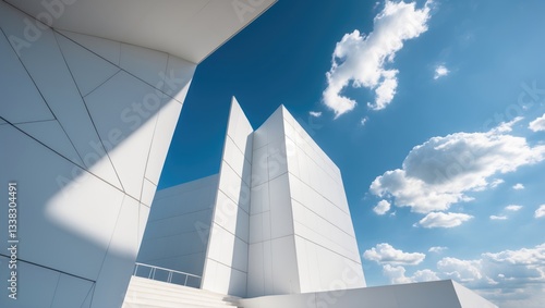 Bright white walls of the building against the azure sky and fluffy clouds. Contemporary architecture. Simplistic design.