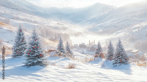 Bright Winter Morning in a Snowy Valley with Festively Adorned Spruce Trees