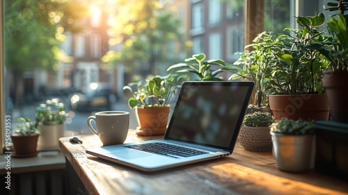 Bright Workspace: Laptop, Coffee, and Indoor Plants on a Sunny Window Sill with a City View, Creating a Cozy and Productive Work-from-Home Environment
