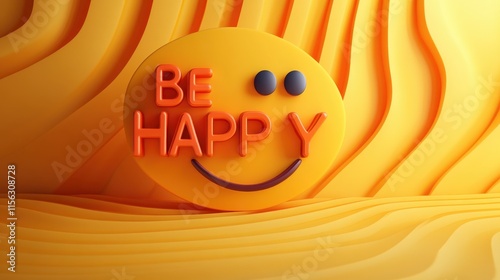 Bright Yellow 3D Smiley Face with Be Happy Message: A Positive and Uplifting Digital Illustration