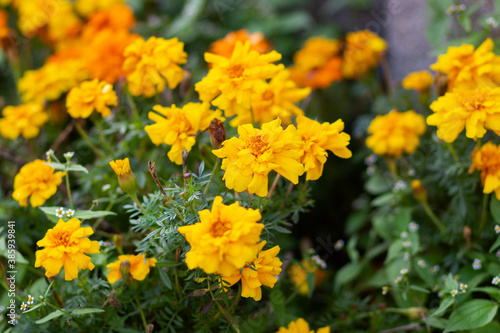 Bright yellow autumn flowers marigolds on a green background