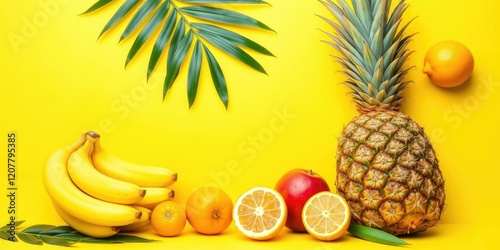 Bright yellow background with a vibrant assortment of fresh fruit including lemons, bananas, pineapples, and mangoes, nutrition, citrus