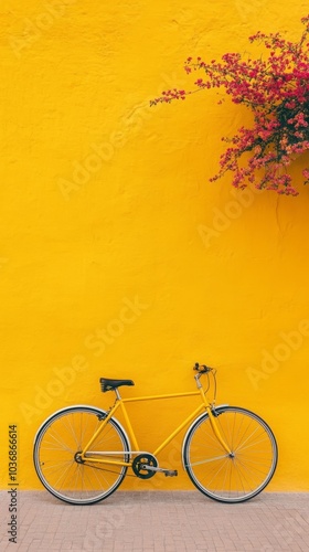 Bright yellow bicycle leaning on a vibrant mustard colored wall in urban setting