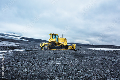 Bright yellow bulldozer against the cloudy sky in highland. Summer 2016 Iceland