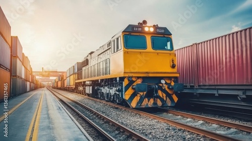 Bright Yellow Cargo Train Arriving at Container Yard with Colorful Shipping Containers and Sunset Sky