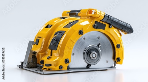 Bright yellow circular saw tool with silver blade against a plain white backdrop