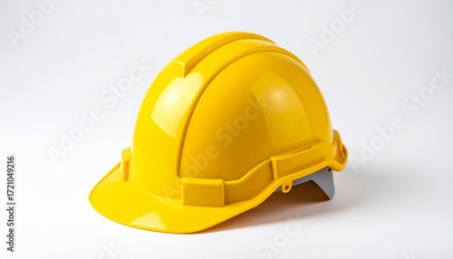 Bright yellow construction hard hat with a smooth dome, short front brim, and side slots for accessories, placed on a white surface for a clean safety equipment presentation.