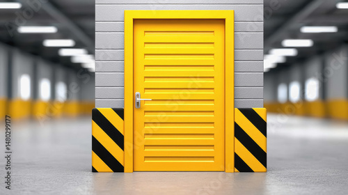 Bright yellow door in a warehouse setting signifying emergency exit with clear markings for safety and accessibility in factory